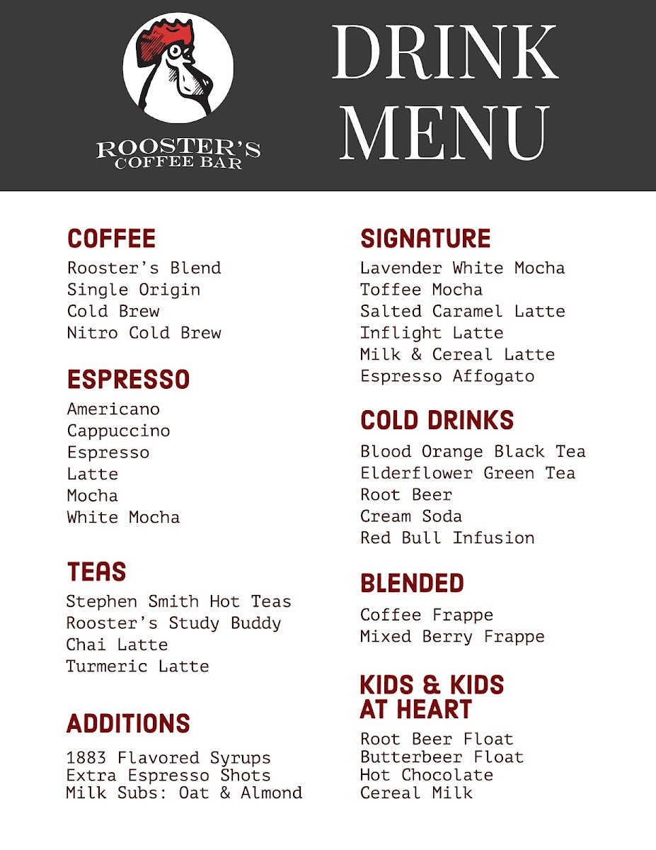 Introducing the menu at Rooster's Coffee Bar, located at 150 S Main St, Slippery Rock, PA, is a delightful experience for coffee lovers and casual drinkers alike. The espresso offerings include classics such as Americano, Latte, and indulgent Mocha variations that promise to warm your day. For those seeking a refreshing twist, the cold drinks menu features unique options like Blood Orange Black Tea and Elderflower Green Tea, perfect for any season.